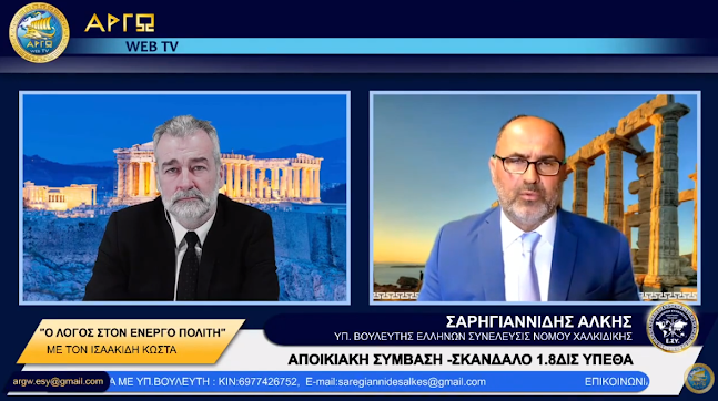 Ο ΥΠΟΨΗΦΙΟΣ ΒΟΥΛΕΥΤΗΣ ΝΟΜΟΥ ΧΑΛΚΙΔΙΚΗΣ ΜΕ ΤΗΝ ΕΛΛΗΝΩΝ ΣΥΝΕΛΕΥΣΙΣ ΑΛΚΗΣ ΣΑΡΗΓΙΑΝΝΙΔΗΣ ΣΤΗΝ ΕΚΠΟΜΠΗ «Ο ΛΟΓΟΣ ΣΤΟΝ ΕΝΕΡΓΟ ΠΟΛΙΤΗ» ΜΕ ΤΟΝ ΚΩΝΣΤΑΝΤΙΝΟ ΙΣΑΑΚΙΔΗ ΣΤΟ ΑΡΓΩ WEB TV.